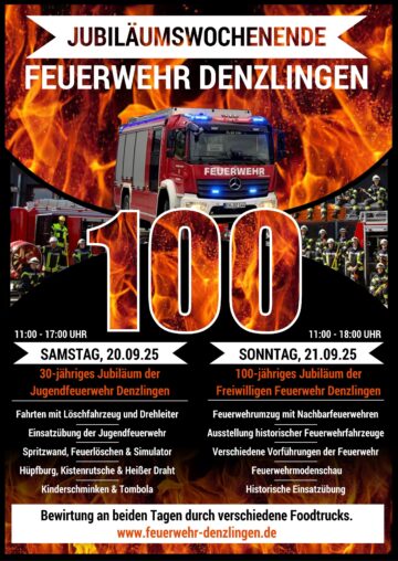 Am 20.+21.09.25 feiert die Freiwillige Feuerwehr Denzlingen ihr 100-jähriges und die Jugendfeuerwehr Denzlingen ihr 30-jähriges Bestehen. Wir würden uns freuen, Sie bei unseren Festlichkeiten begrüßen zu dürfen. Alle Informationen im